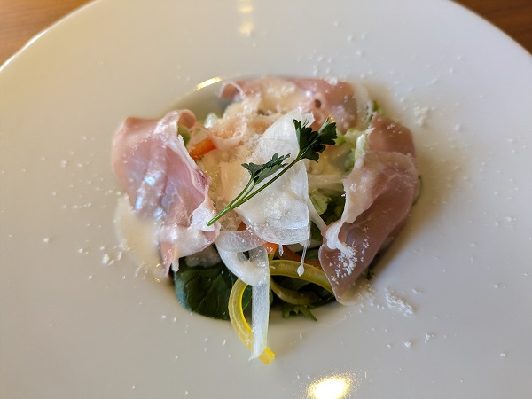 まずサラダ、思ったよりもでっかいのがきた、野菜はサニーレタス、ベビーリーフ、パプリカ、タマネギ、ラディッシュ、トマト、西洋パセリ、と生ハム、粉チーズ、ドレッシングがシンプルでさっぱりしててスゲー美味い。