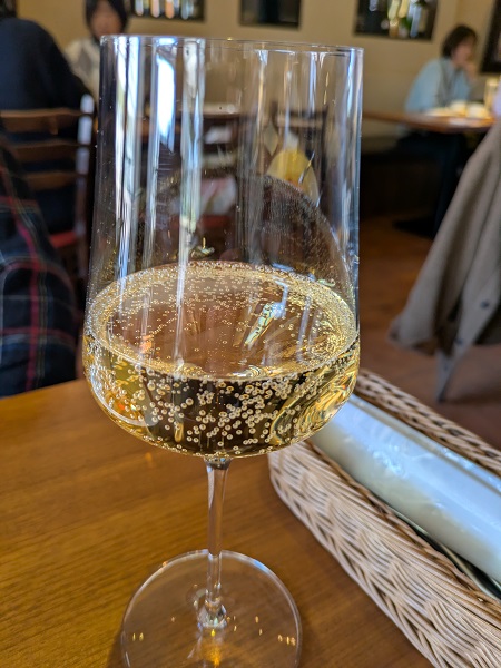 リネンさんは白ワインに、メニューにはシグヌム・ビアンコサントレ トレッビアーノって書いてあります、辛口だけど飲みやすいみたい。