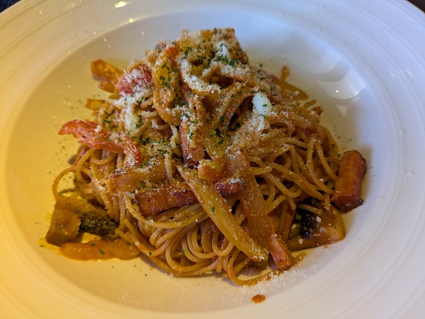 そしてパスタ、オレはチキンクリームボロネーゼ、美味いなぁ、パスタは細めでしっかりアルデンテでいいね…大盛り無料だったから、大盛りにしたらだいぶ多かったよ。