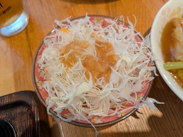 サラダはキャベツと人参、ドレッシングなんだろこれ?