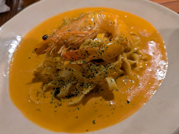 〆、オレはどうしても限定のアメリケーヌソースのパスタが食べたくて、リネンさんはカルボナーラが食べたいって言ってて、二人で一人前でいいかなと思ってたんだけど、どちらも譲らなかったので両方頼んじゃった。