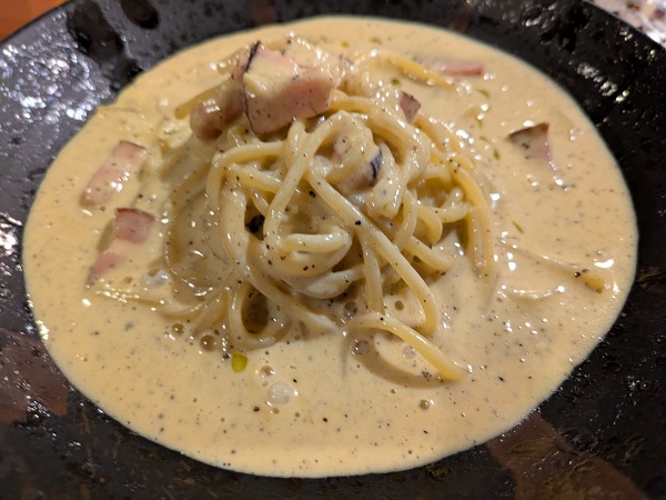 そしてカルボナーラ、すごい、思ったよりもかなりクリーミー、チーズバッチリ効いてて生クリームのなめらかさも十分、ゴロゴロベーコンとかなりかかってる黒胡椒、上品と言うよりはかなりワイルドな印象のカルボナーラ、ヤバいこれは相当美味いよ。