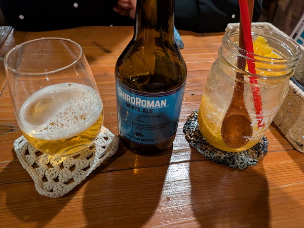 リネンさんはクラフトビール、しろロマンっていうのを、香りオレンジピールで飲み口フルーティで飲みやすいみたい、でも一杯でいいって…オレはゼロカシス生オレンジで乾杯。