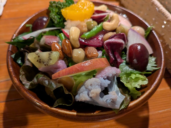 まずパワーサラダをハーフで、サニーレタス、ブロッコリー、カリフラワー、わさび菜、ロマネスコ、トレビス、アスパラガス、ビーツ、紅しぐれ大根、さつまいも、りんご、栗、柿、キウイ、オレンジ、豆類、ナッツ類、チキン…いや美味い。