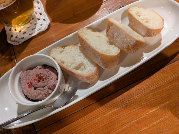 リネンさん希望のレバーペースト、バゲット柔らかめで美味いんだけど、オレレバーつけないんでオリーブオイルくらい欲しいかなぁ。