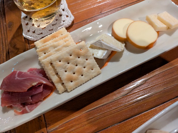 生ハムとチーズのハーフ盛り、生ハムとクラッカー、チーズは左下からカビはえてるっぽいのはブリー、長方形なのがタレッジオで両端の色が変わっててケーキみたいな感じになってる、三角のがマンチェゴ…うーん、あんまりチーズの違いはまだワカランね。