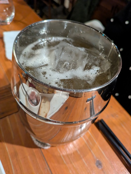 リネンさんはギガハイボール、ジンビームのハイボール三杯分、海賊が飲むような樽ジョッキできた…ジンビームのキャンペーン中でちょっと割り引きな値段になってます、結果二杯(六杯分)。
