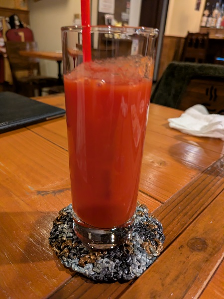 オレは来店ポイントで500円以下のドリンクがいただけるのでゼロレッドアイをお願いしました、ビール+トマトジュースのカクテルで、ノンアルコールビールとトマトジュースで作られたものッスな、オレはアルコールがダメなだけでビールの味は嫌いじゃないんで全然美味いね。