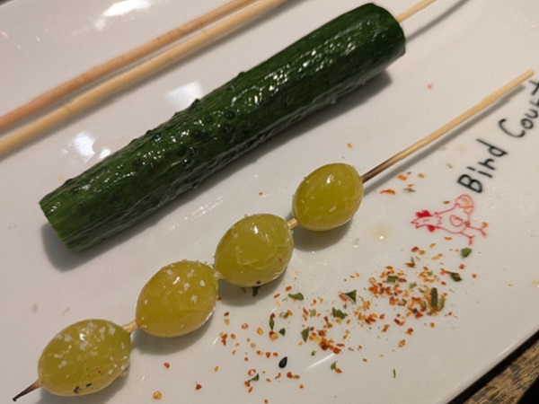 ミニキュウリのぬか漬けは串に刺さってて面白いけど食べづらいので切ってほしいかも。