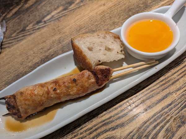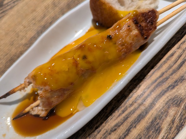 つくね、卵黄かけていただきます、二枚目はそのまま一口食べてから卵黄かけたので食べかけ失礼…ほわ〜、つくね美味いなぁ、歯応えあるはあるけどつくねになってるので食べやすいし、卵黄合うしもう一本くらい欲しい。