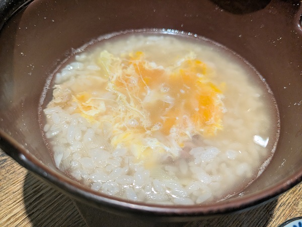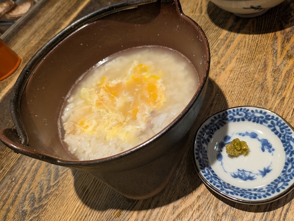 〆に軍鶏の雑炊、鉄鍋熱々、軍鶏出汁が美味いんだから雑炊が美味くないわけないし、二人でわけてちょうどいい感じでした。