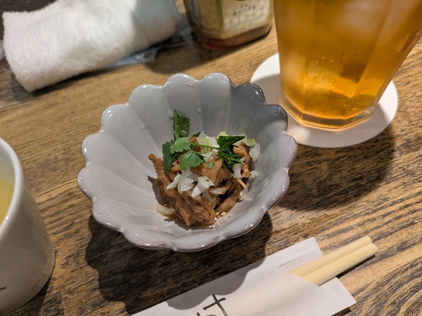 小鉢で軍鶏皮の二杯酢、軍鶏皮はまあまあな歯応えで軍鶏っぽさ抜群、パクチーのいい風味がプラスされて考えられてるなと。