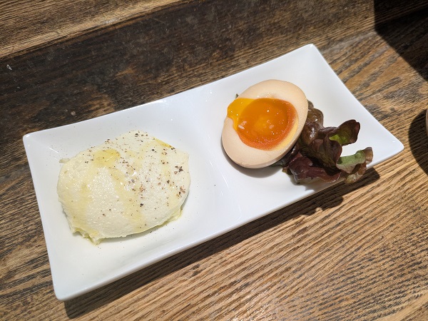 前菜、青大豆豆腐と軍鶏の半熟煮玉子、豆腐はオリーブオイルと胡椒がかかってて、なめらかと言うよりは少し手作り感あってこれはこれでかなり美味い。