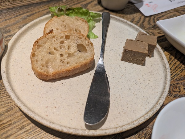つくね食べきったらパンでタレと卵黄をぬぐっていただきます、こちらのパンは柔らかくてぬぐいやすくなってます。