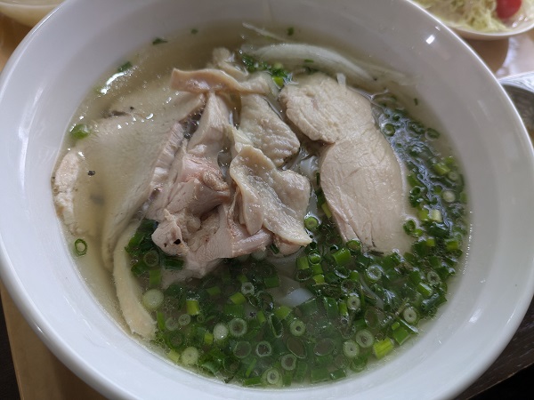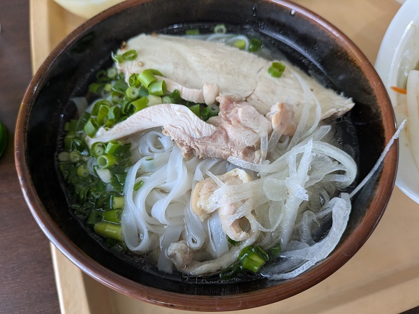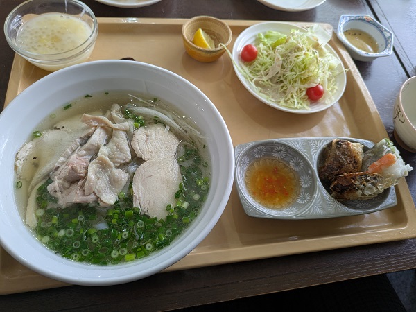 リネンさんは鶏フォーのセット、鶏フォー、サラダ、生春巻きと揚げ春巻き、とタピオカ入りスイーツ。