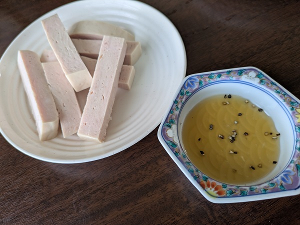 おつまみに豚ハム、なんとなく歯触りとかが魚肉ソーセージっぽいけど、豚ハムって書いてあるから豚なんでしょう…ニョクマムに合うな。