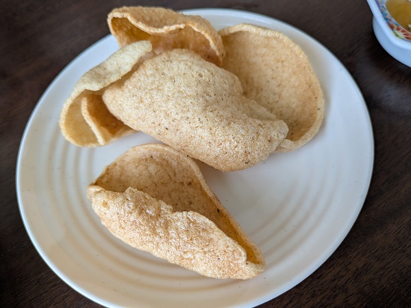 サービスですって出されたののが多分ベトナムのエビせんべい、サクよりはちょっと固めな塩梅かな。