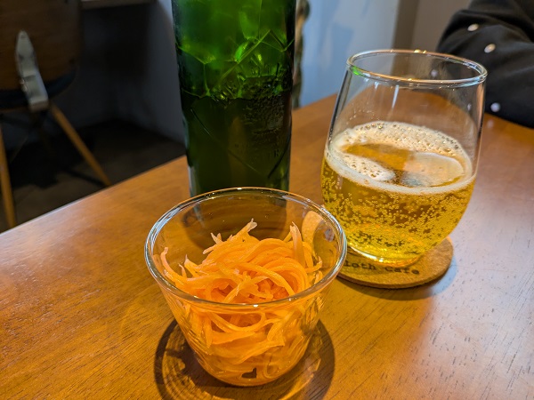 リネンさんはハートランド、おつまみにキャロットラペを、キャロットラペは千切り人参のサラダ、甘酸っぱい感じ。