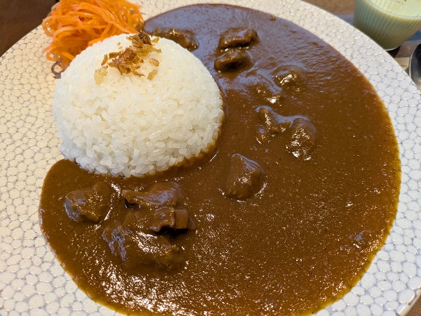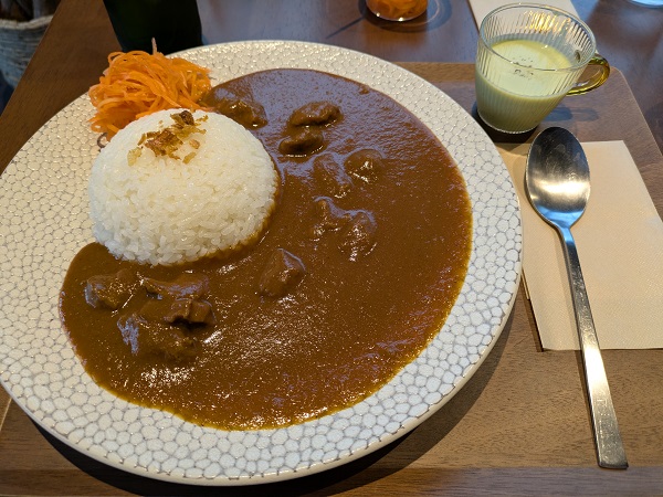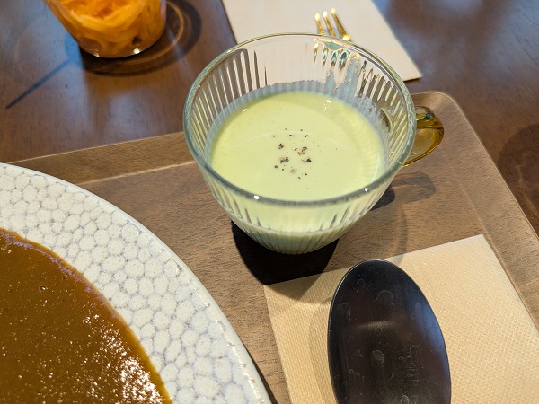 ライスはジャポニカ米、キャロットラペがいい箸休め、あとスープも付いてきて枝豆の冷製スープでもこちらも口直しにピッタリ。