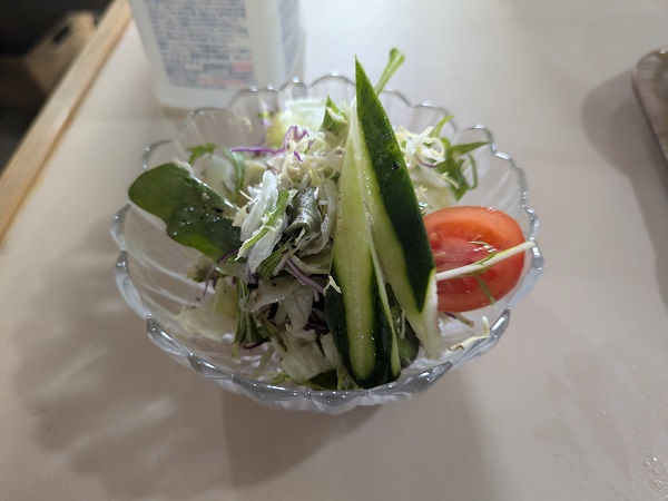 ミニサラダはキャベツ、紫キャベツ、きゅうり、水菜、トマト、シャキッとしててさっぱりなフレンチドレッシング。