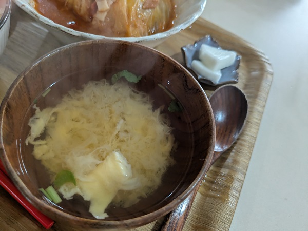 汁物は卵汁、味噌汁でなくて吸物、味噌が沈んでるように見えるのはフワフワな卵、こちらもあっさり気味でかなり美味い。