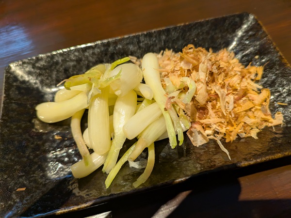 おつまみに島らっきょう、生だけどゴマ油で薄く味ついてるみたいね、鰹節つけると和テイストに。