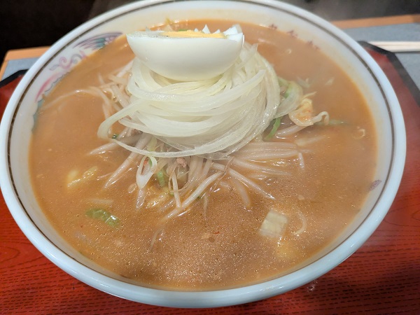 リネンさんは味噌タンメン、上のぐるぐるっとなってる白いのはタマネギ!あぶな、頼むところだった。